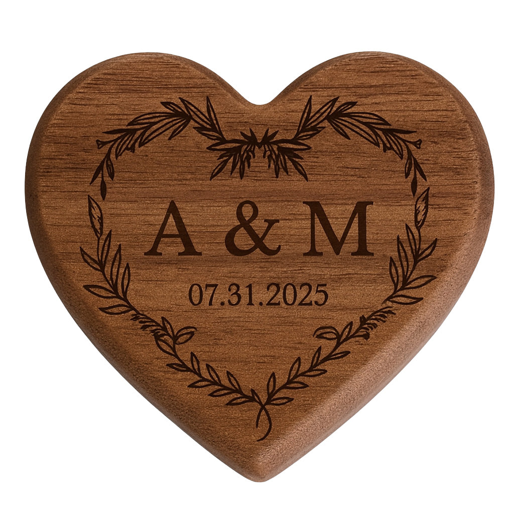 Express your love with this handcrafted heart-shaped ring box made from rich walnut wood. The smooth exterior features custom engraving with initials and a date, framed by a delicate botanical wreath. Inside, a plush black velvet insert secures your ring in refined contrast, creating a warm yet elegant presentation for proposals, weddings, or keepsake gifting.
